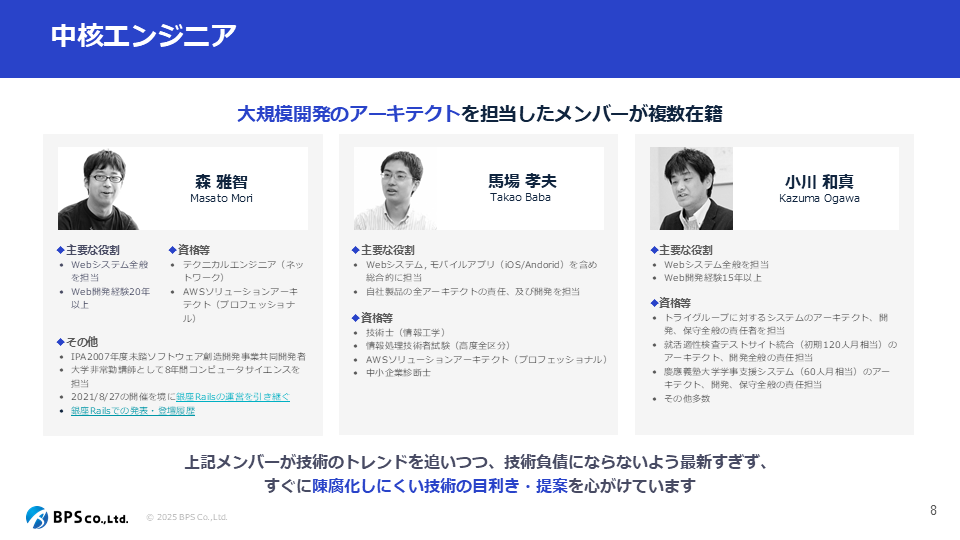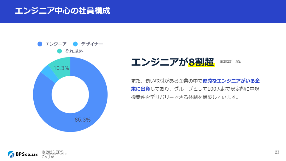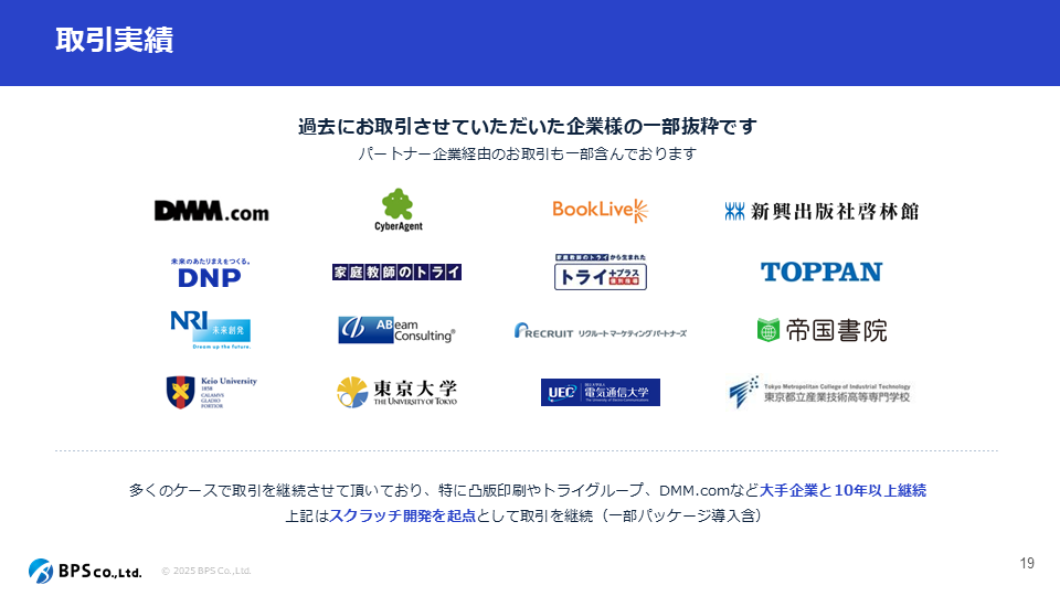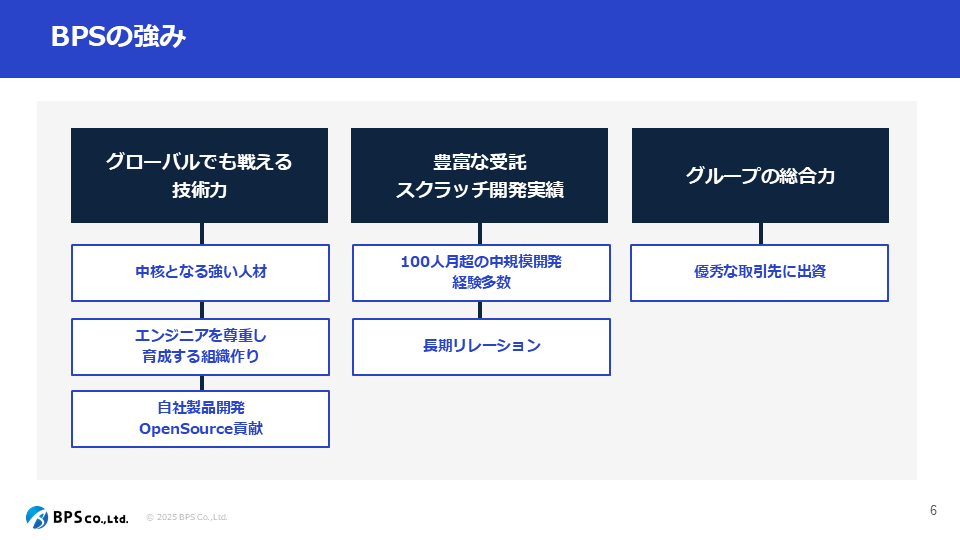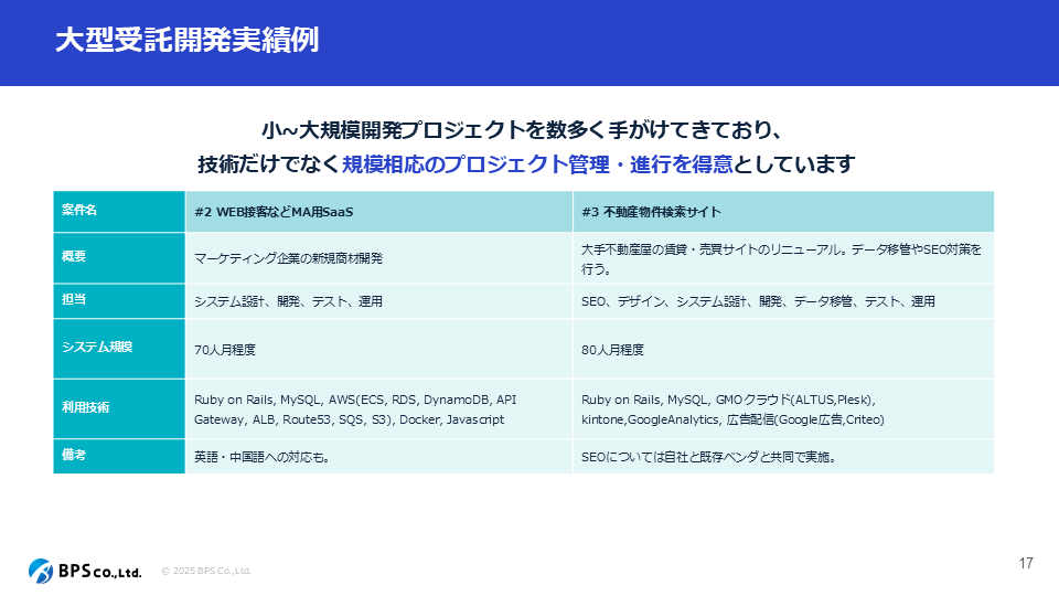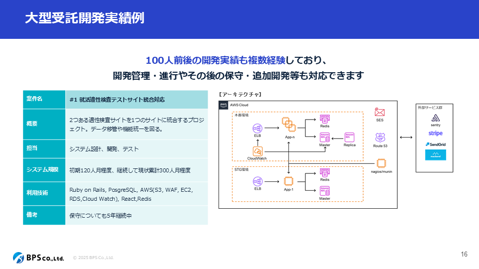 BPSの受託開発 お気軽にご相談ください グローバルでも戦える技術力 お気軽にご相談ください お気軽にご相談ください 豊富な受託スクラッチ開発実績 お気軽にご相談ください お気軽にご相談ください グループの総合力 お気軽にご相談ください 得意な言語・フレームワーク・プラットフォーム・キーワード Ruby / Ruby on Rails PHP / Laravel, CakePHP, FuelPHP Android / iOS AWS / 運用保守 Design & Marketing お気軽にご相談ください 開発チームのご紹介 BPS開発チームの紹介~Web開発第1チーム~(2025年度) BPS開発チームの紹介~Web開発第2チーム~(2025年度) BPS開発チームの紹介 〜アプリチーム〜(2025年度版) BPSデザインチームの紹介(2024年度) お気軽にご相談ください