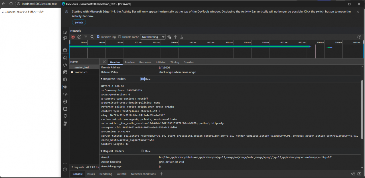 今度はRailsが管理するキャッシュの中でセッションデータを管理する構成例での挙動を確認してみます。