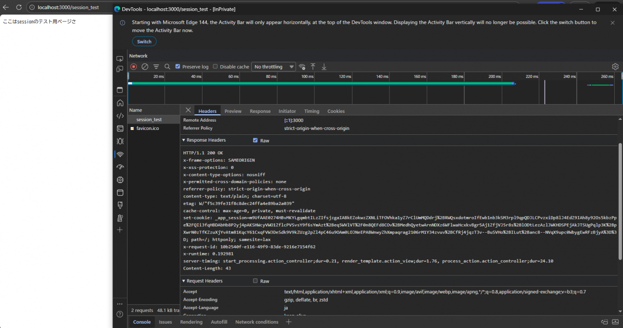• ブラウザ側に保存されるCookieの値は保存したいsessionの値をRails側で暗号化したもの