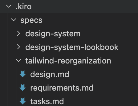 .kiro/spec/*の下に、要件・設計・具体的なタスクを生成するのを支援してくれます。あまり欲張らずに、作業やissueごとに3つのファイルを生成するぐらいの粒度がちょうどよさそうです。