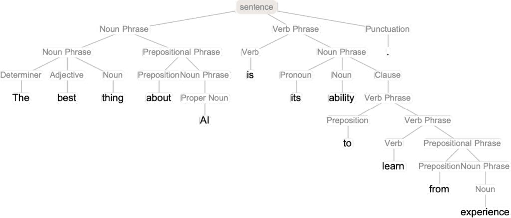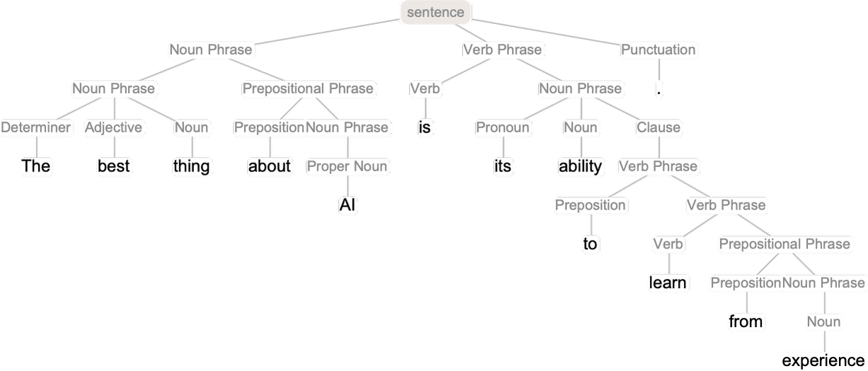 このような文法構造は、(少なくとも近似的には)「構文解析木(parse tree)」と呼ばれるものの組み合わせ方法を定義する一連の規則によってキャプチャできます。