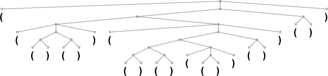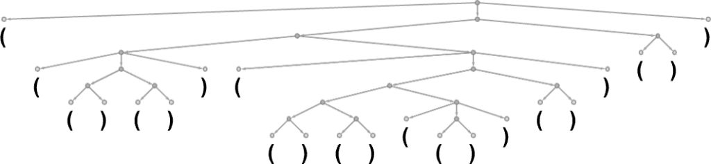 以下のように、開きかっこ(と閉じかっこ)のシーケンス(sequence: 連なり)だけでできた言語を考えてみましょう。この言語には、「開きかっこと閉じかっこが常に対応していなければならないという文法」があるとします。