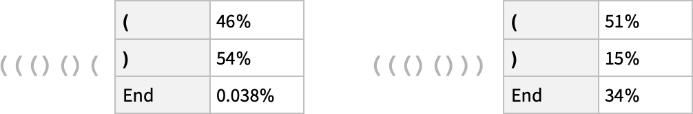 例1(上図の左)では、ネットワークはシーケンスがその位置で終了しないことを確率的に「ほぼ確信している」と言えます。ここで終了してしまうと丸かっこの対応が崩れてしまうので、これは望ましい答えです。