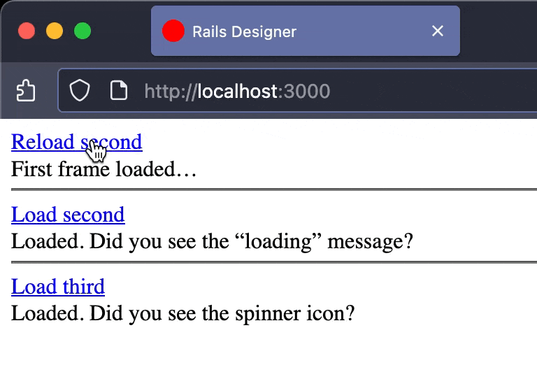 Loading...もスピナーも表示せずに、"First frame loaded..."が即座に"First frame reloaded..."に変わります。 - 2番目の"Load second"をクリックすると、即座に