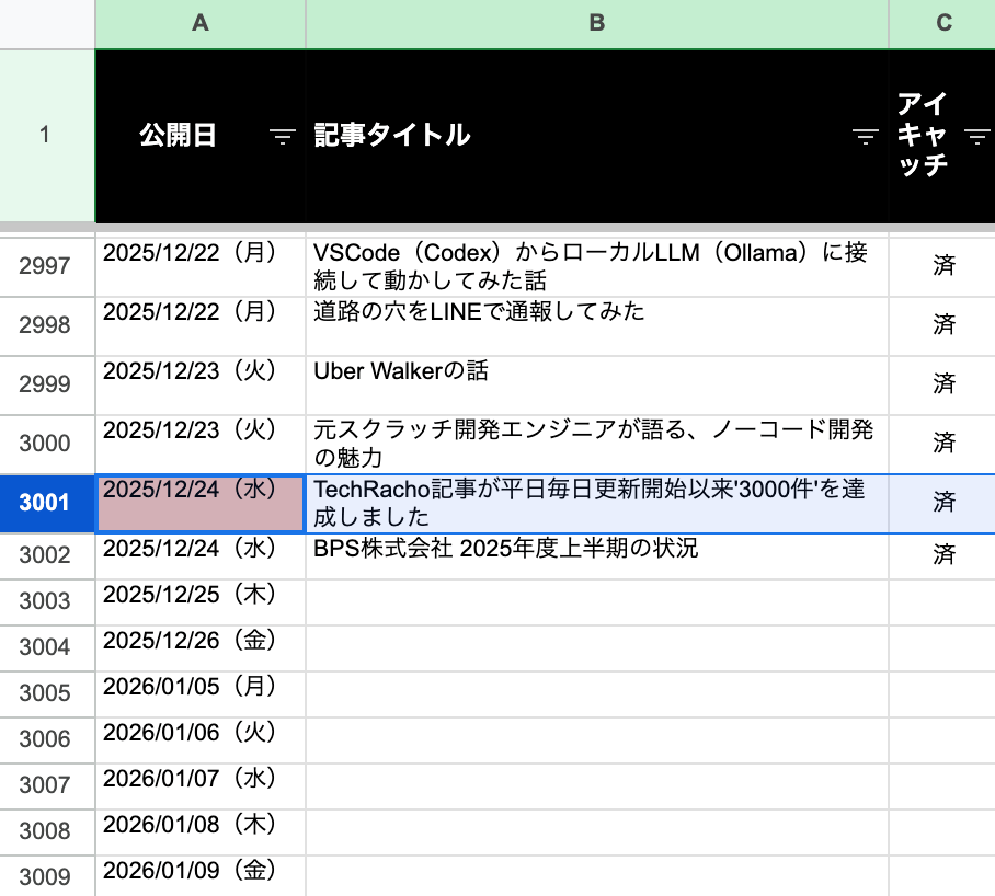 BPS株式会社の技術ブログ「TechRacho」の平日毎日更新が2016年8月17日に開始して以来公開した記事数が、本日2025年12月24日(火)クリスマスイブに、この記事をもって通算で3000件に達しました😂🎉