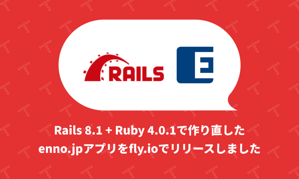 こんにちは、hachi8833です。 2013年から私が運営している日本語のあからさまなエラーを検出するWebサービス、enno.jpをRails 8.1とRuby 4.0.1で完全に作り直し、2月8日からリリースしました。使い方はリニューアル前と基本的に同じですが、多数の改良を加えました。 サイト: enno | 日本語の文章のタイポ・誤字脱字検出ツール リニューアルの概要については更新情報に手短に記載してありますが、本記事ではRailsやSaaSなどについてもう少し説明します。個別について詳しくは追って記事にしたいと思います。 1: SaaSをHerokuからfly.ioに乗り換えた サイト: fly.io … 続きを読む Rails 8.1 + Ruby 4.0.1で作り直したenno.jpアプリをfly.ioでリリースしました