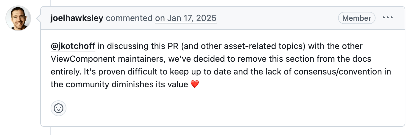 @jkotchoff: このプルリク(およびアセット関連の他のトピック)についてViewComponentの他のメンテナーたちと協議した結果、ドキュメントからこのセクションを完全に削除することが決定された。このセクションを最新に保つことが困難であり、コミュニティ内でのコンセンサスや規約との整合性が取れないことで価値が目減りしているため。