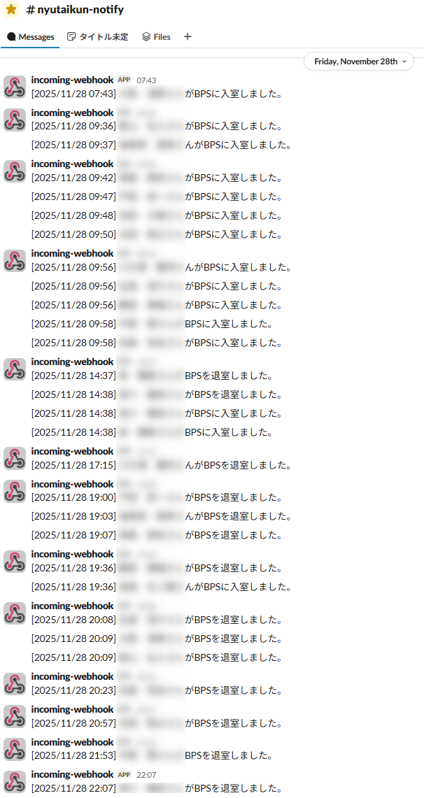 BPSでは、ビヨンド入退がオフィスの出入りを通知してくれます。あれれ?大半フルリモートでオフィスに誰もいなかったはずの入退室システムからこれだけの入退室通知が・・・?