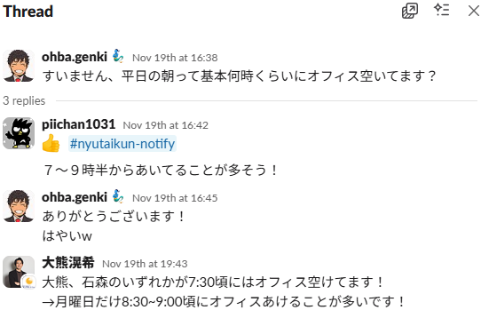 リモート選択可能な弊社では、フルリモートされている方が非常に多いです。たまに出社したい人や何かの用事で都内に出る人は、会社に立ち寄っても同僚に会えない。会えないどころかオフィスも開いてない、なんてこともありました。そんな状況から生まれたイベントの1つが社内飲み会です。これはこれでとてもいいなと思いつつ、ふらっと会社に立ち寄ることができて、そうしたら誰かがいて楽しいなという状況もあると良いですよねえ。