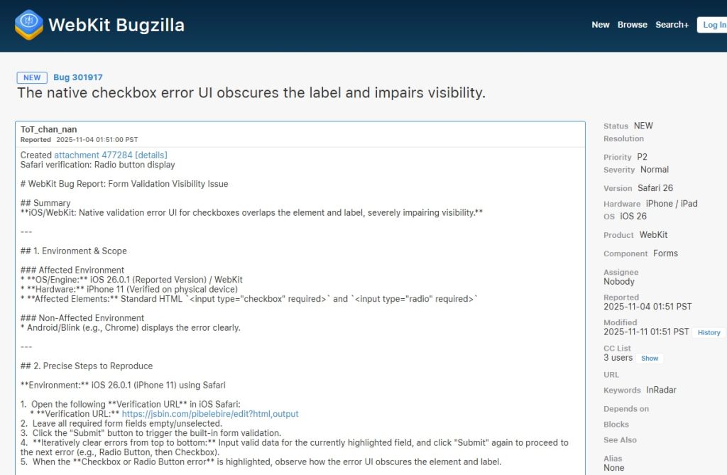 注目は、WebKitのバグを発見し、Apple社に英語でバグレポートを提出してもらったことです。