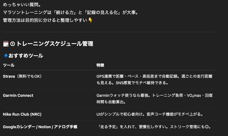 この中だと、Garmin Watchは持っていないし、NRCはあまりピンとこない、Googleカレンダーはあまり予定外のことは書きたくないのと、Notionは記録するページを作成するのがちょっと面倒なことを考えると、Stravaに決定しました。